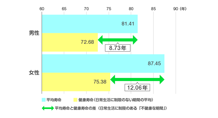 平均寿命は81歳から85歳に増加し、健康寿命は71歳から73歳に増加しました。しかし、そこには約10年の差が依然として存在します。
